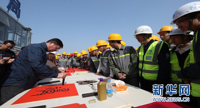 王躍慶為建設者們現場寫“?!弊?。新華網發